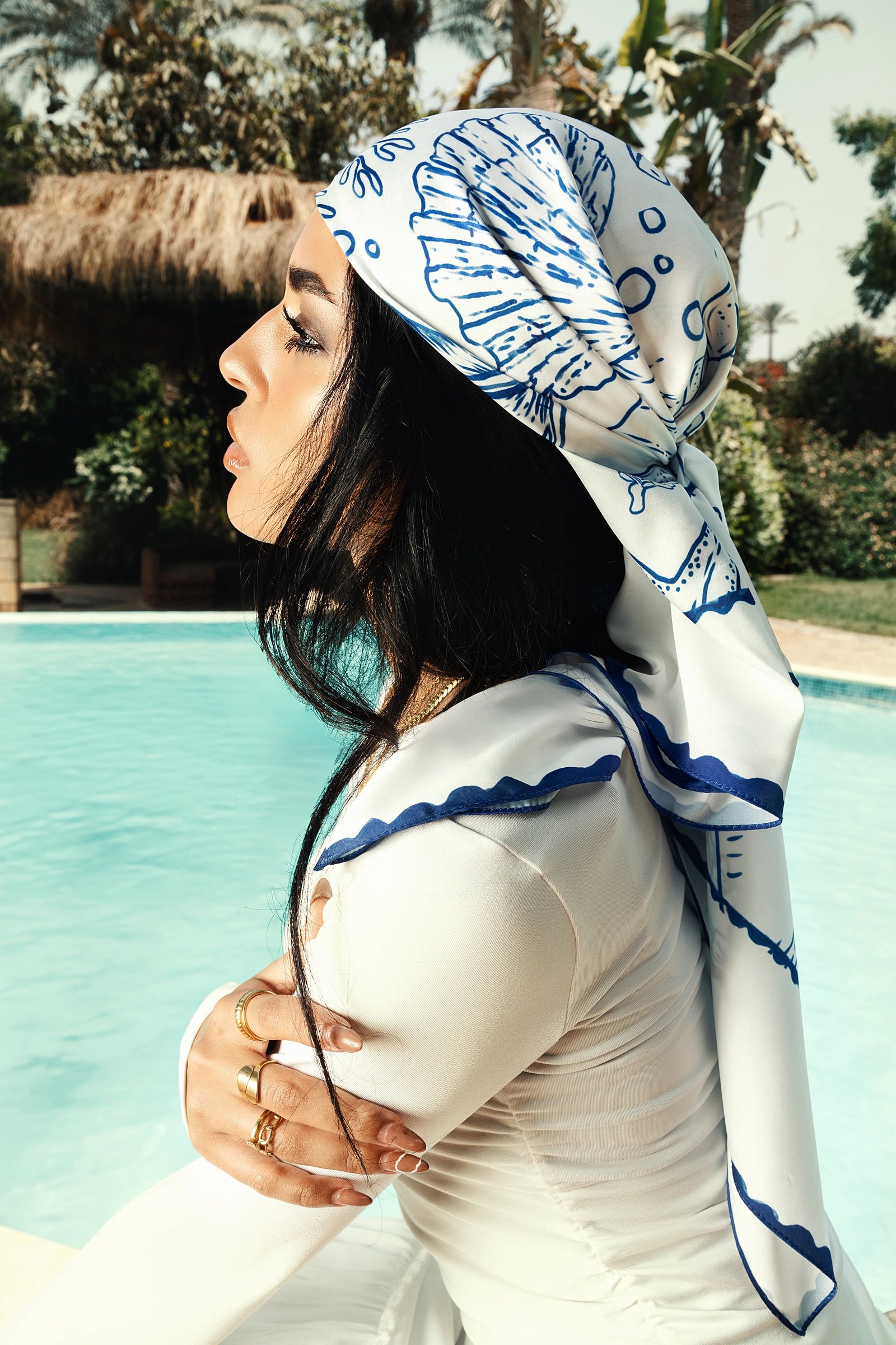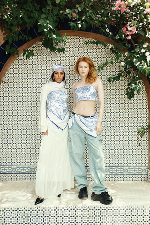 Printed in deep ocean blue on smooth, lightweight satin, this piece is a wearable sketchbook of coastal memories.