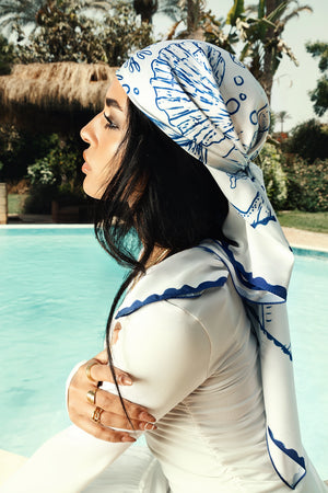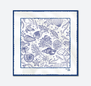 This satin scarf brings the sea to life with hand-drawn illustrations of shells, coral, fish, and. everything that whispers summer.