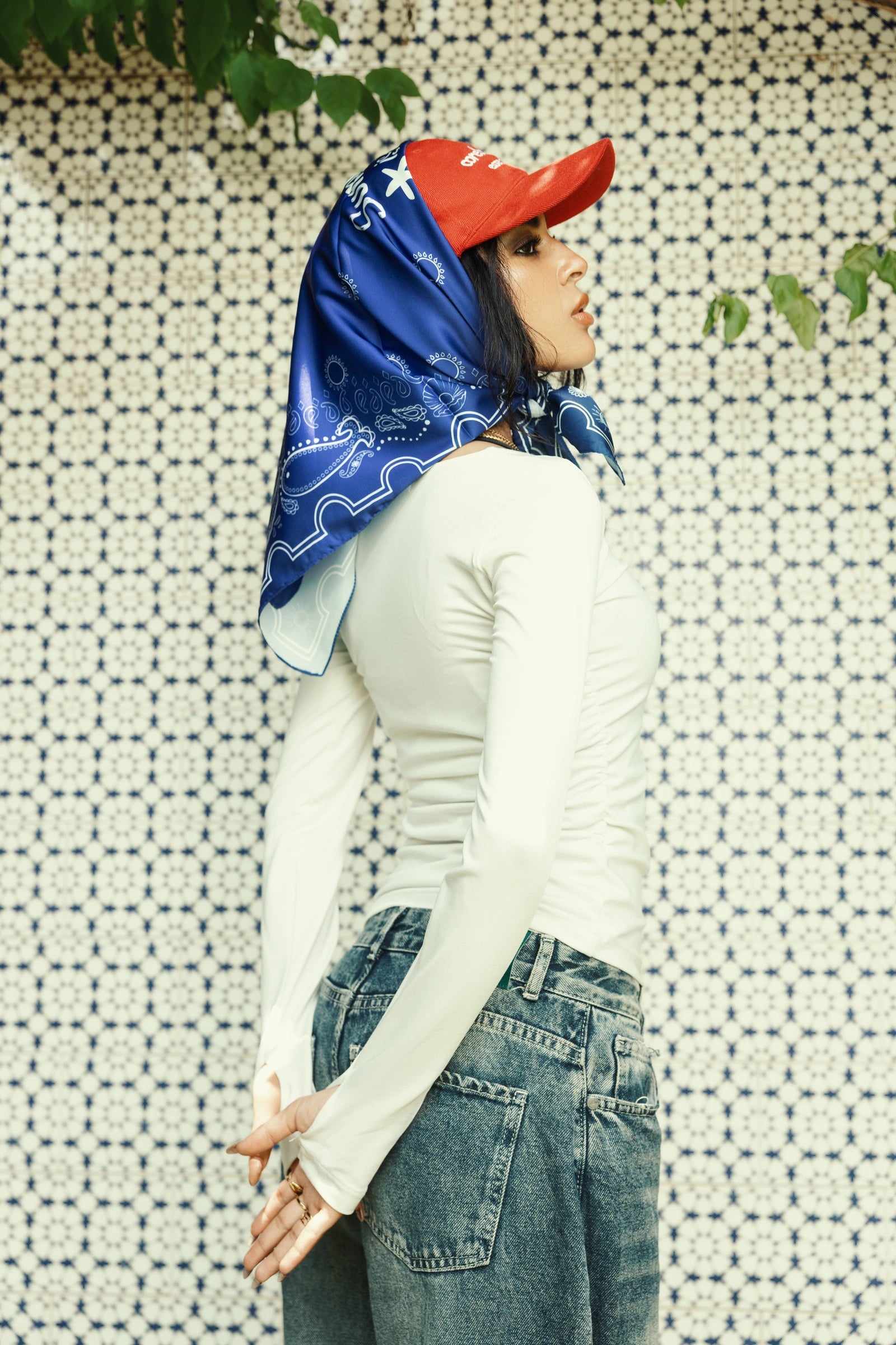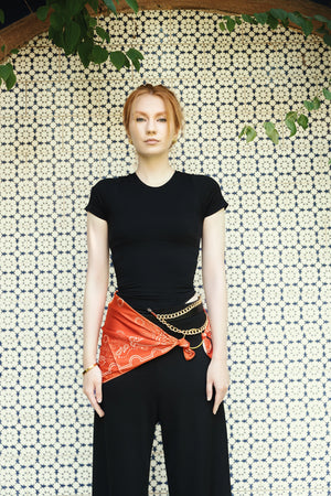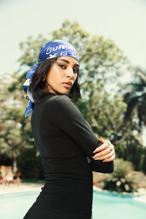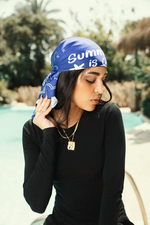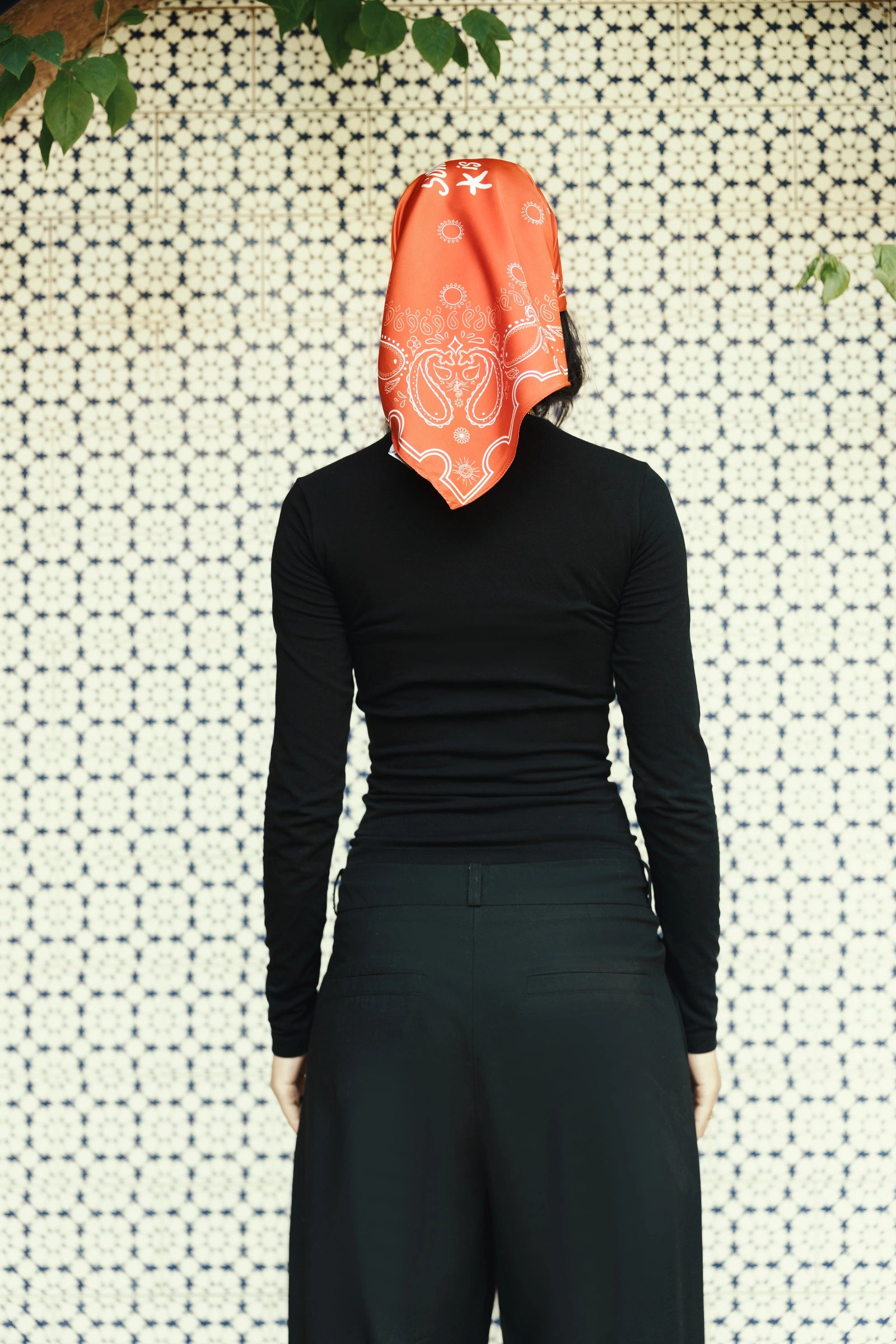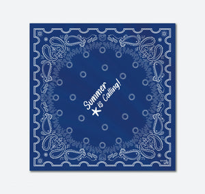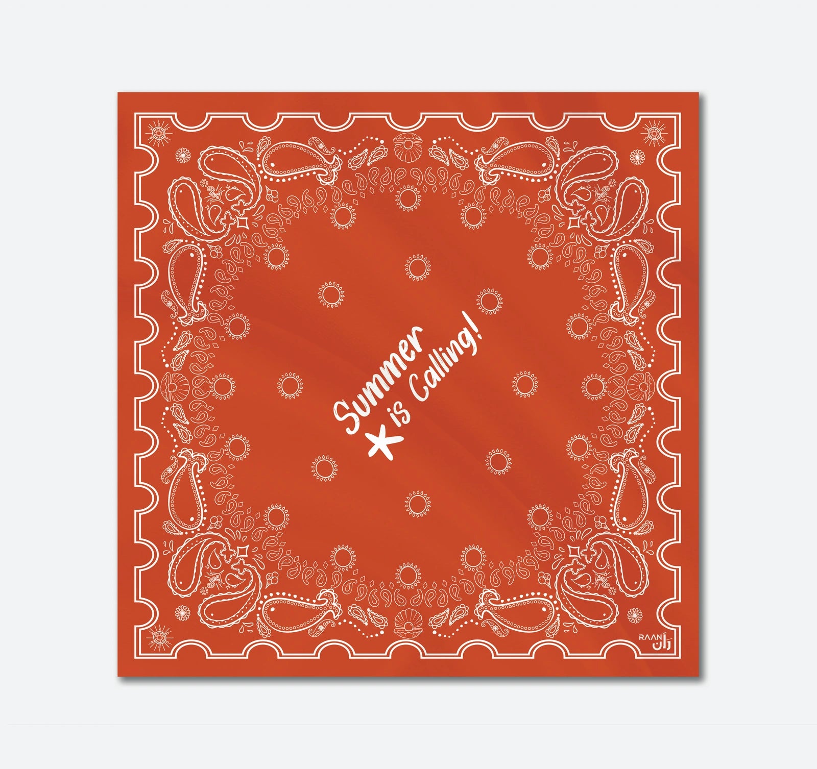 A classic summery paisley bandana, reimagined in bold sunset orange, hand-drawn by our Egyptian artists and stamped with the message: Summer is Calling!