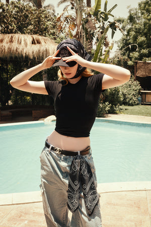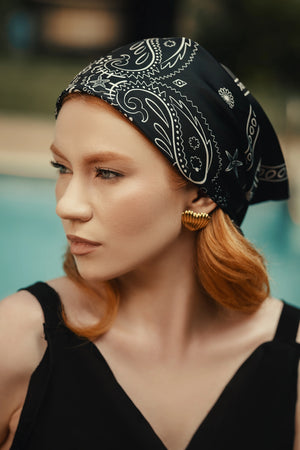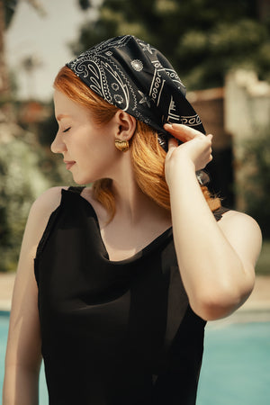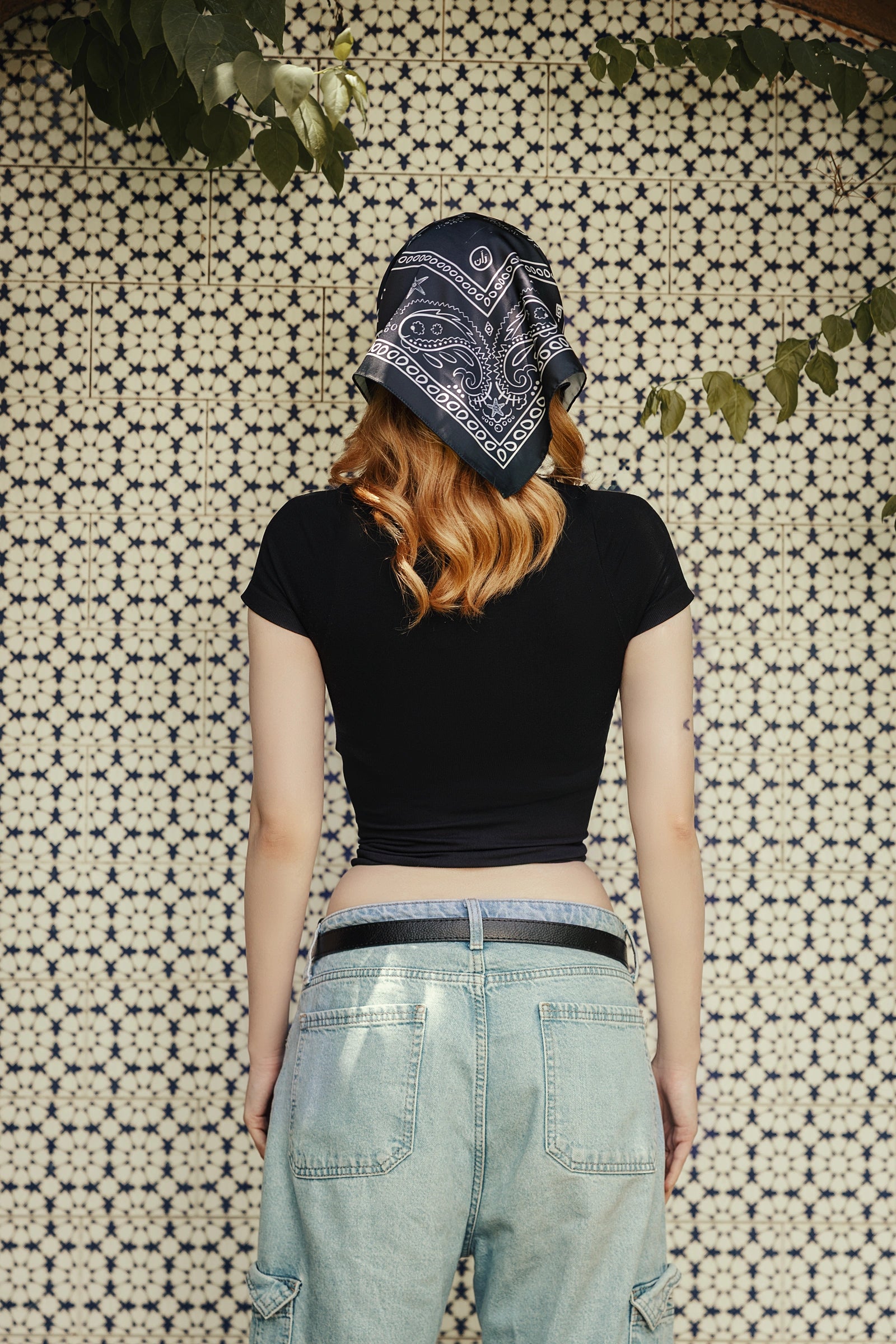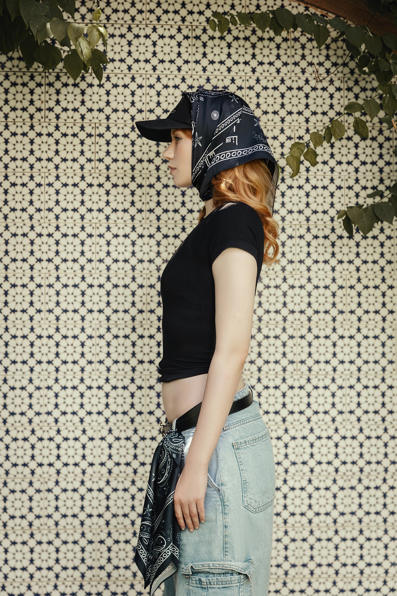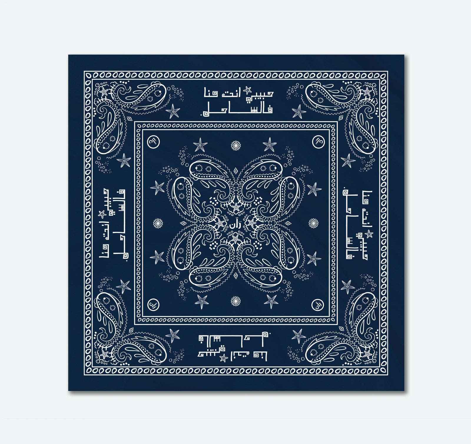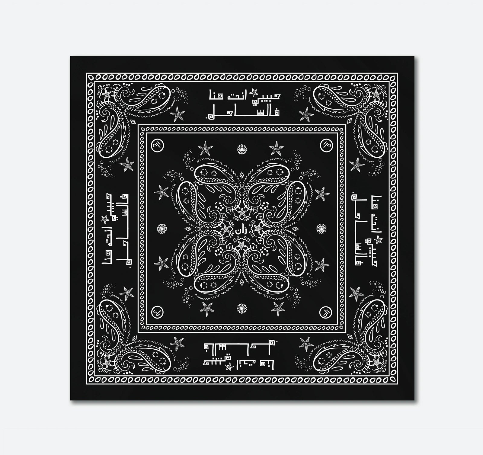 This printed satin scarf blends traditional bandana patterns with bold Arabic calligraphy.