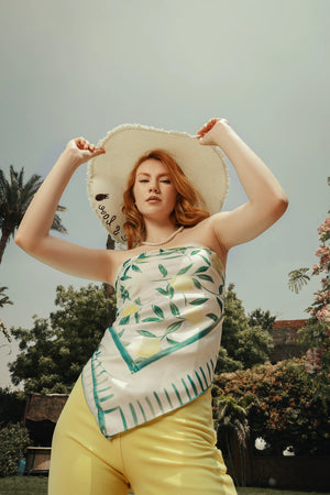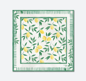 This satin scarf captures the crisp joy of summer lemons—hand-drawn with soft